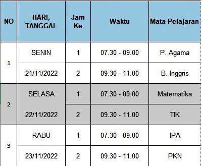 Di informasikan kepada seluruh peserta didik dan wali murid kelas 7, 8 dan 9 bahwa pelaksanaan kegiatan Penilaian Akhir Semester (PAS) Ganjil Tahun Pelajaran 2022/2023 akan dilaksanakan mulai tanggal 21 - 25 November 2022 dengan sistem online.Oleh se...